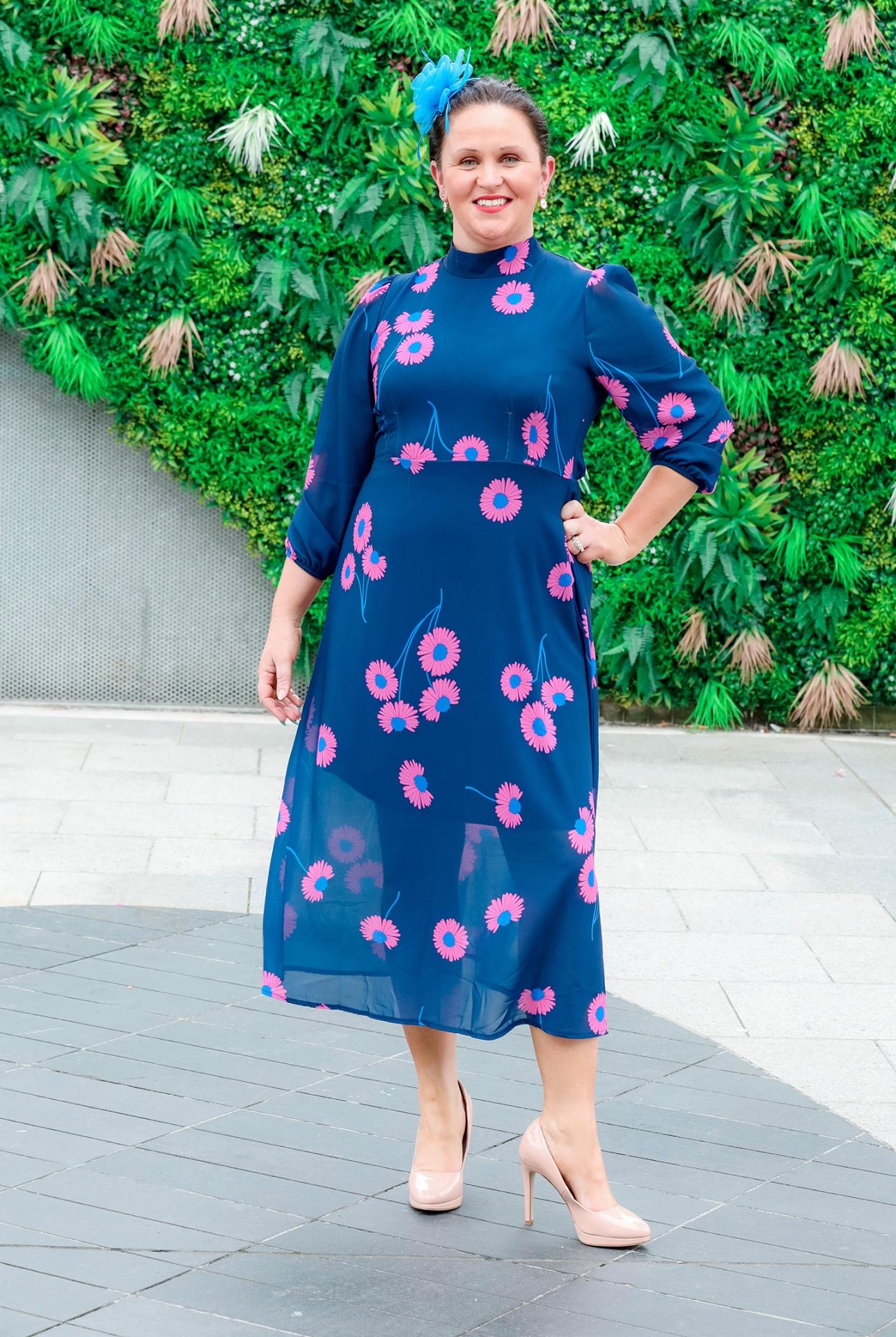 Pala D’Oro Mollie dress in navy floral €59.95 , fascinator €14.95. All from Carraig Donn, Whitewater SC, Newbridge